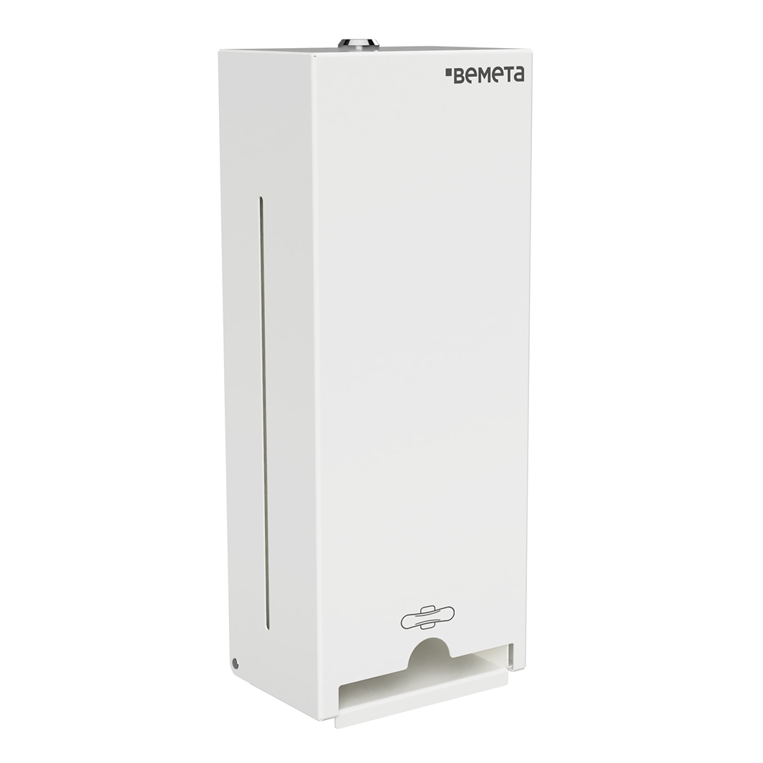 Ogni scatola contiene 55-60 assorbenti nel formato abituale e in pezzi singoli. I fori stretti sui lati permettono di vedere facilmente se il contenuto deve essere riempito. Per riempire, basta sbloccare il vassoio con la chiave, estrarlo e riempirlo.
